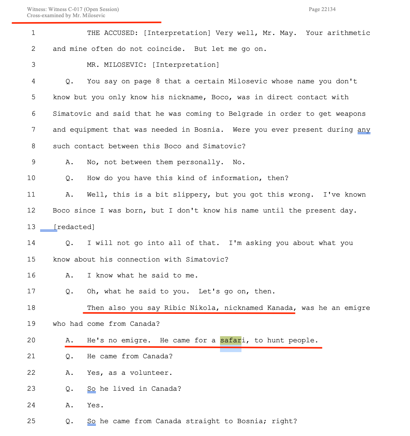 “Nije emigrant. Došao je na safari, loviti ljude”, odgovorio je svjedok C-017.