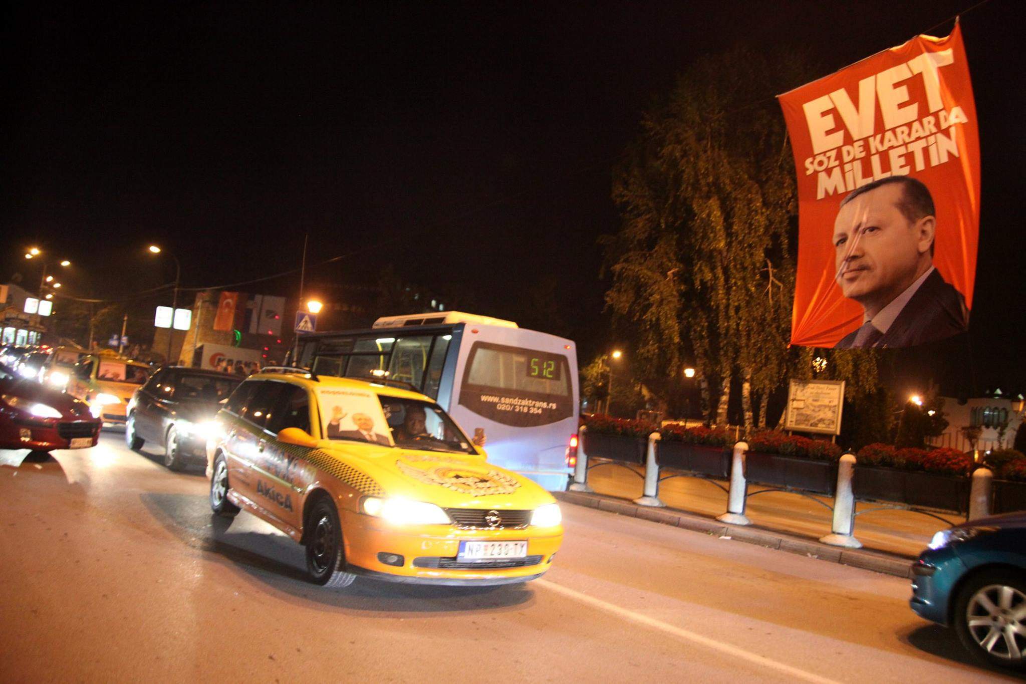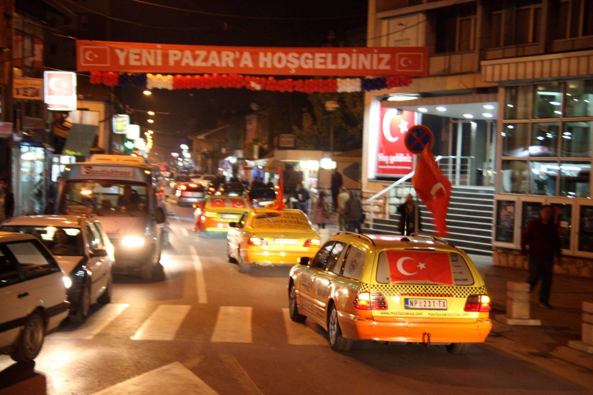 Više stotina novopazarskih taksista, organizovanih u koloni, sa istaknutim turskim i bošnjačkim zastava i posterima Erdogana, uz zvuke sirena, provozali su se centralnim gradskim ulicama i starim dijelom grada.