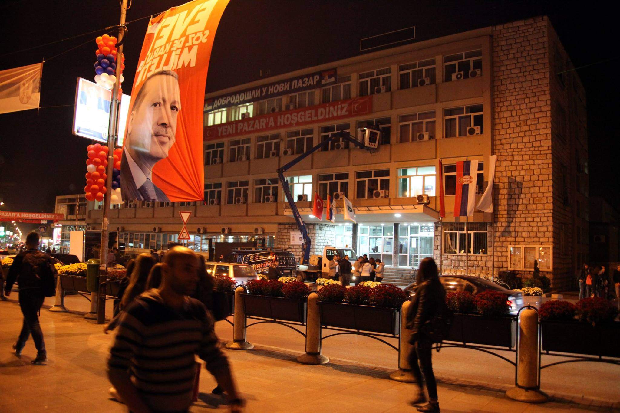 Na zgradi gradske uprave Novog Pazara, ćiriličnim pismom i na turskom jeziku ispisano je "dobro došli", odnosno "hošgeldiniz". Preko puta okačen je transparent Vučić-Erdogan.