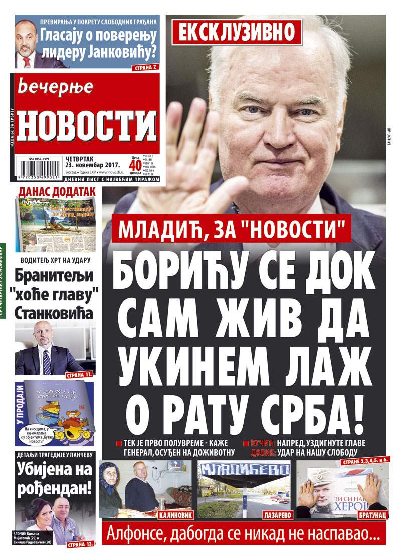Informer jutros prenosi na naslovnoj strani izjavu zločinca Mladića da je njega „NATO osudio“, a Kurir da je „sve ovo laž“ .