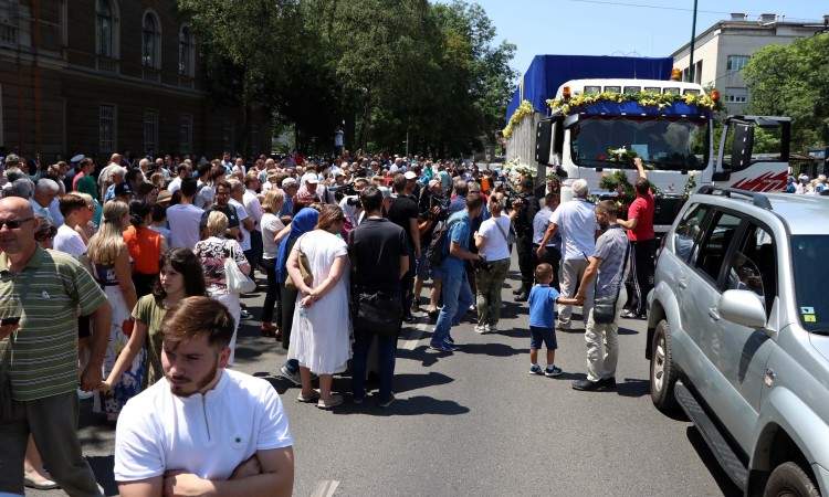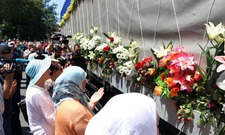 Član Predsjedništva Bosne i Hercegovine Bakir Izetbegović poklonio se danas u Sarajevu pred tabutima žrtava genocida u Srebrenici koji su na kamionu jutros krenuli u Visokog put Potočara gdje će u utorak biti ukopani nakon više od dvije decenije od ubistava.