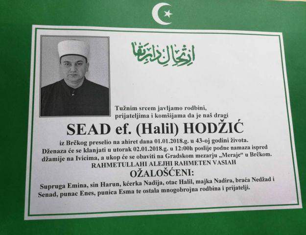 Na Gradskom mezarju „Meraje“ u Brčkom u utorak je obavljena dženaza-namaz profesoru Seadu ef. Hodziću, imamu džamije na Klancu u Brčkom, koji je iznenada preselio na Ahiret u 43. godini, prenosi bh. informativni servis INS.