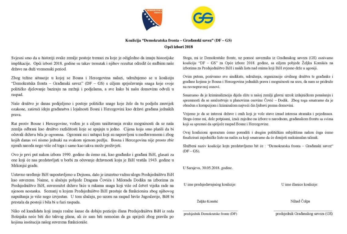 Demokratska fronta (DF) i Građanski savez (GS) potpisali su danas u Sarajevu koalicioni sporazum o zajedničkom nastupu na oktobarskim Općim izborima.