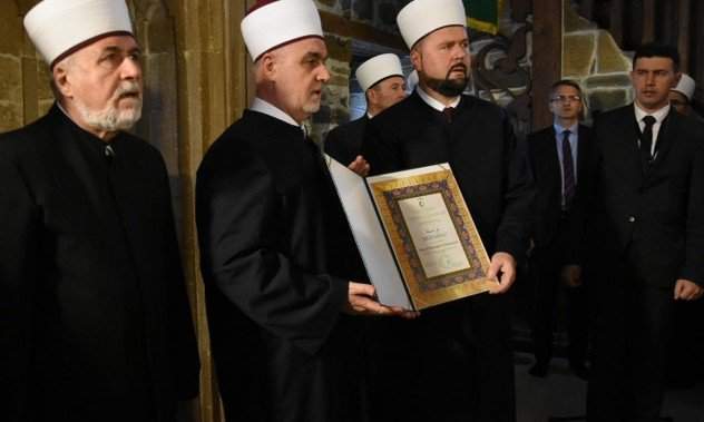 Reisu-l-ulema Islamske zajednice u Bosni i Hercegovini Husein ef. Kavazović na prigodnoj svečanosti u Sultan Ahmedovoj džamiji (Čaršijska džamija) u Zenici večeras je inaugurirao te uručio muraselu novom muftiji zeničkom hafizu Mevludinu ef. Dizdareviću, prenosi Fena.