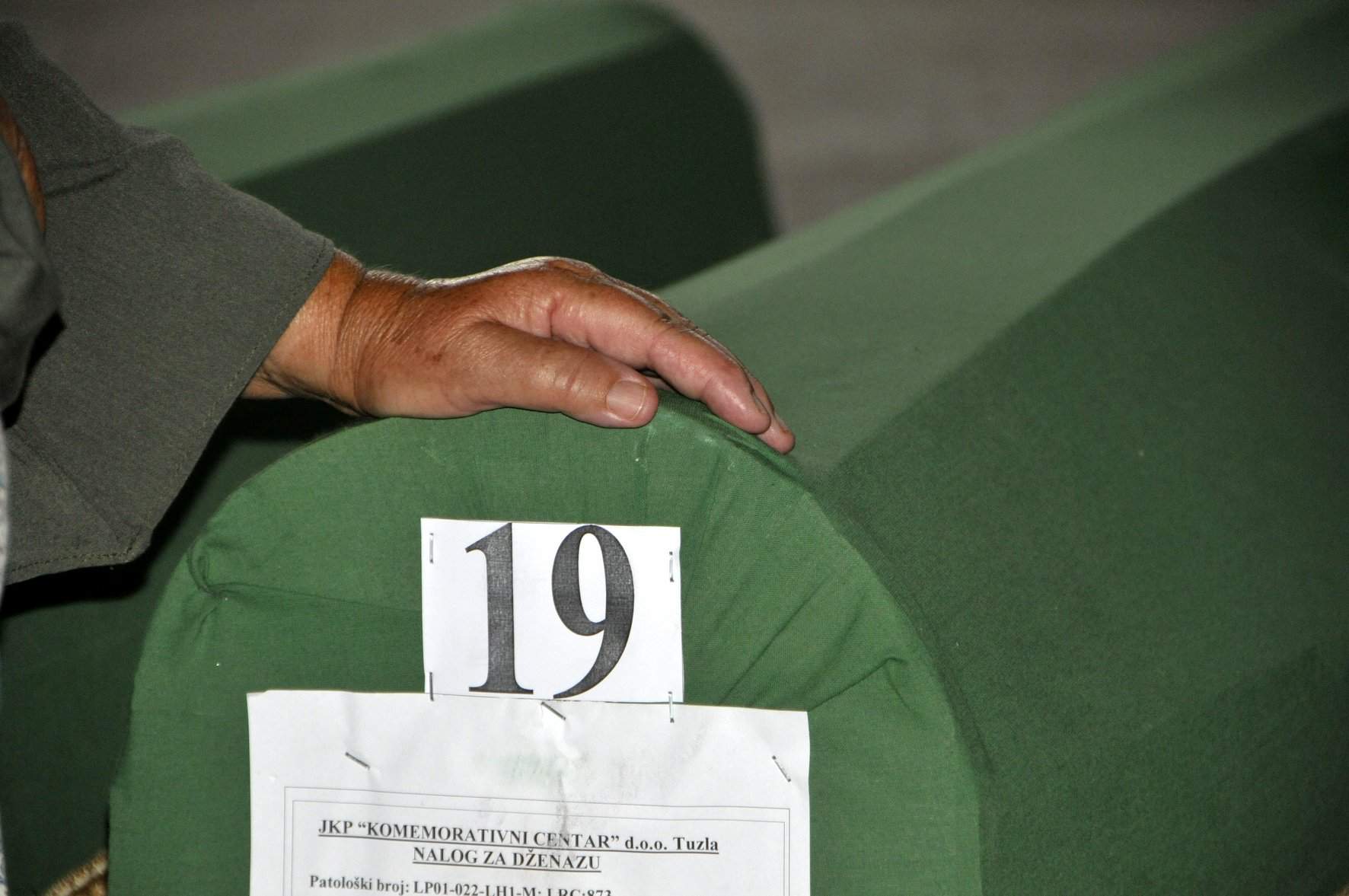 Dok priča, miluje zeleni tabut u kojem se nalaze samo kosti jedne šake brata Adila Suljića.