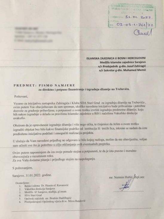 "Vezano za inicijativu zastupnika Zahiragića (Adija, op.a.) i Kluba SDA Stari Grad za izgradnju džamije na Trebeviću, ovim putem vas obavještavam da sam spreman, ukoliko navedena inicijativa bude prihvaćena i potrebne dozvole za građenje pribavljene, u potpunosti o svom trošku izvršiti izgradnju", navodi se u pismu Hubića.