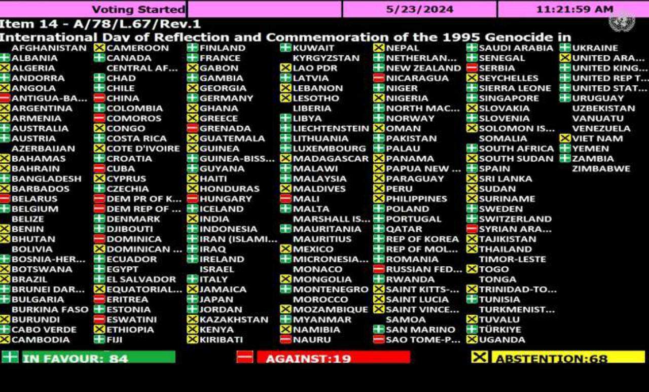 Generalna skupština Ujedinjenih nacija u četvrtak, 23. maja, je usvojila Rezoluciju o genocidu u Srebrenici. Za Rezoluciju su glasale 84 zemlje, dok je 19 zemalja bilo protiv, a 68 suzdržano.