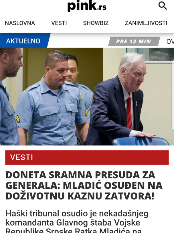 Pink Željka Mitrovića prenosi kako je „doneta sramna presuda za generala“. Novosti, list poznat po svom nacionalizmu, u kojem je davne 1986. godine objavljen i zlokobni Memorandum SANU-a, prenosi izjavu ratnog zločinca da će se „boriti dok je živ da ukine laž o ratu Srba“ (!?).