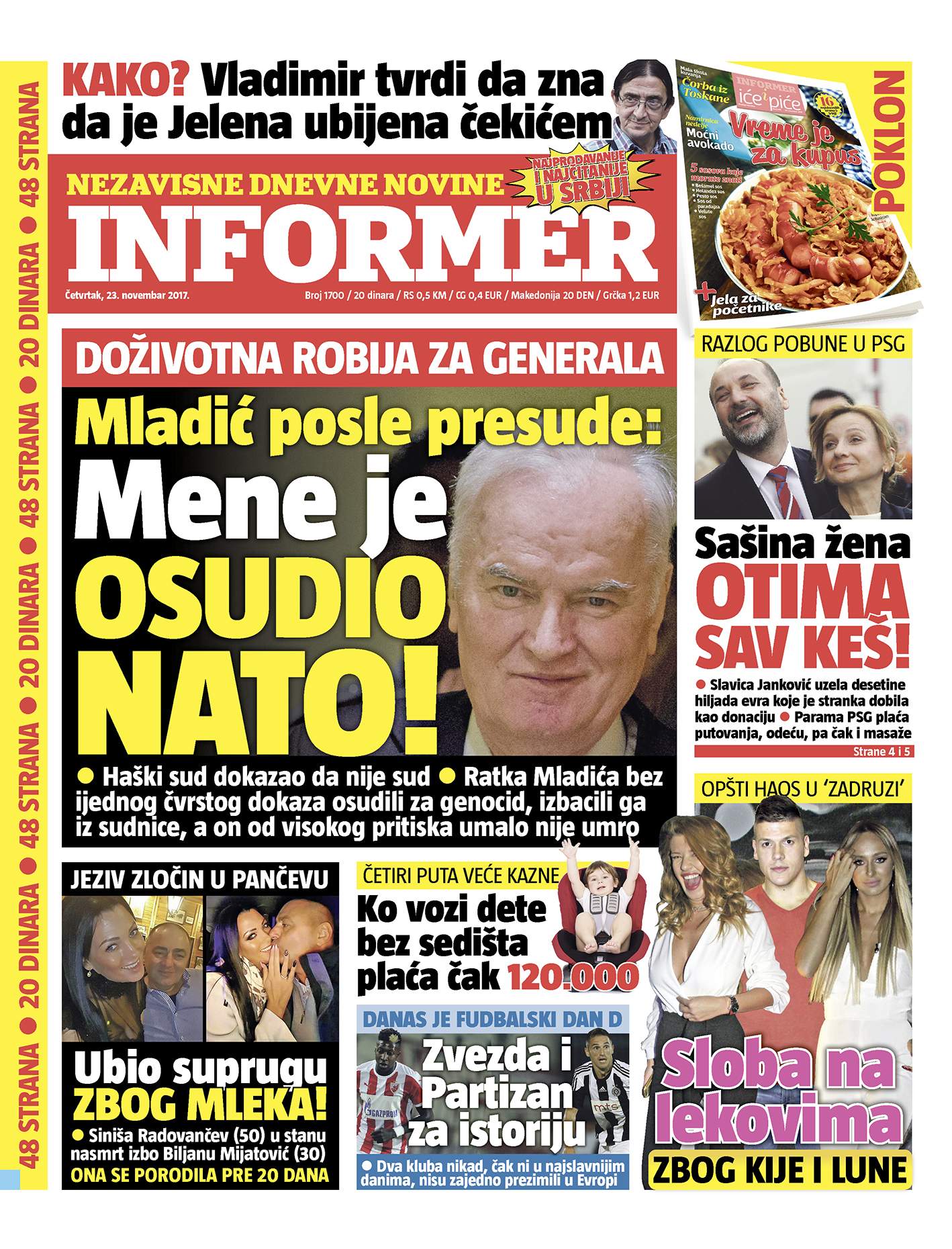 Informer jutros prenosi na naslovnoj strani izjavu zločinca Mladića da je njega „NATO osudio“, a Kurir da je „sve ovo laž“ .