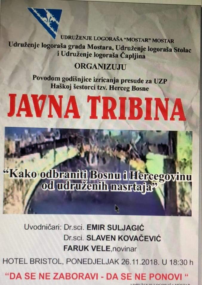 Kao govornici na tribini planirani su Slaven Kovačević, Emir Suljagić i Faruk Vele. Tribina će se održati 26. novembra u mostarskom Hotelu Bristol s početkom od 18:30.